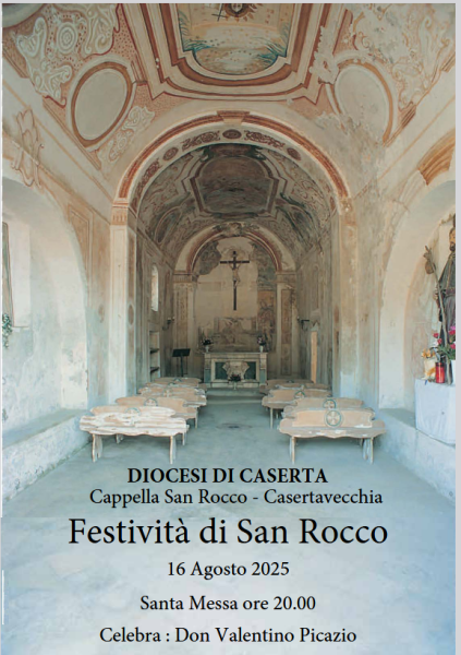 Durante la celebrazione della festività di San Rocco a Casertavecchia, si officerà una santa messa in onore del santo, nella cappella di San Rocco, una chicca artistica, dove sono presenti all’interno statue e affreschi di pregevole fattura. L’evento religioso, raggiungerà il suo culmine, con il rito della santa messa, che si terrà sabato 16 agosto 2025 alle ore 20.00. La cerimonia religiosa sarà officiata da Don Valentino Picazio, che invita la comunitaria e i fedeli a partecipare a questo momento di preghiera e devozione in onore di San Rocco. L’evento si svolgerà in un luogo significativo, la Cappella di San Rocco, situata nel suggestivo borgo di Casertavecchia, contribuendo a creare un’atmosfera di raccoglimento e tradizione. La giornata del 16 agosto a Casertavecchia è tradizionalmente dedicata alla celebrazione del santo, per la forte devozione delle comunità locali. La cappella di San Rocco è situata nel borgo medievale, ed è aperta al pubblico, e ai fedeli per l’occasione festiva. La festa di San Rocco a Casertavecchia, pur non essendo una festa patronale rappresenta comunque un momento importante per la comunità locale, che si stringe intorno al santo per onorarlo e partecipare alle celebrazioni.