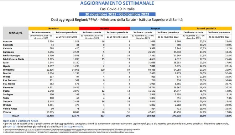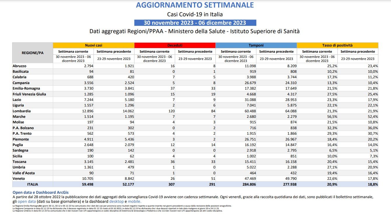In figura: l’ultimo bollettino settimanale rilasciato dal Ministero della Salute.