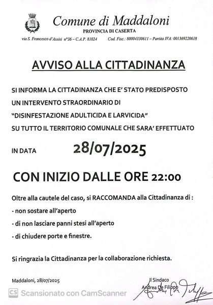 Ho provveduto ad emanare apposita ordinanza che recepisce le direttive impartite dalle Autorità sanitarie e, di fronte all’inerzia della autorità sanitarie competenti, ho disposto Interventi massicci e ripetuti di disinfezione adulticida e larvicida sul territorio. La situazione è sotto controllo e non ricorrono gli estremi per dar luogo a comportamenti improntati ad un allarme generalizzato ed ingiustificato. Continueremo a monitorare la situazione, aggiornandovi sugli sviluppi del caso.