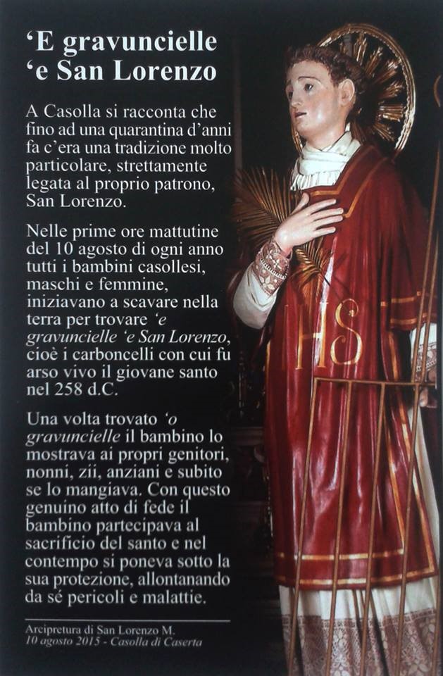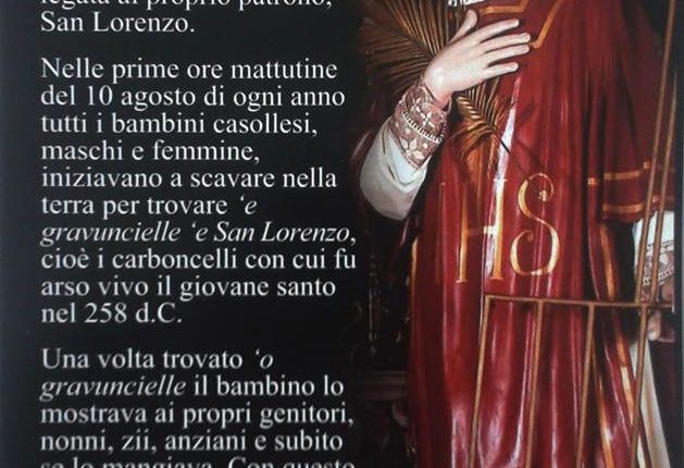 Una volta, e possiamo ben dire quasi fino agli inizi degli anni Cinquanta del secolo scorso, era ben viva, ad esempio, a Casolla la tradizione de “‘e gravuncielle ‘e San Lorenzo”. Che cosa era? I bambini, sia maschi che femmine, ma tutti con un’età inferiore ai 7-8 anni si mettevano alla ricerca di carboncelli, che si riteneva fossero quelli con cui fu arso il giovine santo. Il bambino che trovava ‘o gravunciello subito lo mostrava ai propri genitori e nonni e davanti a loro se lo mangiava. In questo modo il bambino si metteva sotto la protezione del santo, il quale da lui allontanava pericoli e malattie, che, nei secoli passati, erano un vero e proprio flagello per i bambini, tant’è che v’era un elevato di mortalità infantile. L’ex-arciprete di Casolla, don Fernando Latino, ben consapevole della oggettiva impossibilità di far continuare praticamente la tradizione, per poterne tramandare il contenuto culturale-religioso, durante la festività di San Lorenzo faceva distribuire un foglietto su cui era scritto il racconto della relativa tradizione ed allegato al foglietto v’era un sacchettino con dentro tre-quattro pezzetti di pane nero, appositamente fatti preparare, come ricordo dei carboni.
