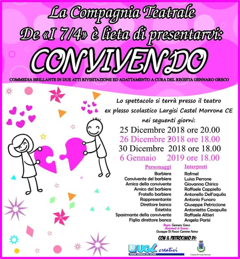 CASTEL MORRONE – Nell’ambito della Attività natalizie, Raffaele Altieri, (in arte Rafmel), responsabile UGL creativi Caserta, è lieto di presentare la Compagnia “I 7/4” nella commedia comica napoletana “Convivendo”, opera brillante in 2 atti con rivisitazione e adattamento a cura del regista Gennaro Greco. Lo spettacolo si terrà presso il teatro ex Largisi di Castel Morrone in provincia di Caserta con il patrocinio del Comune di Castel Morrone. L’occasione sarà anche utile per una raccolta fondi a favore per l’Associazione “La casa di Matteo”. La Casa di Matteo” è un progetto speciale che prevede la realizzazione di due case di accoglienza per bambini orfani con disabilità medio e gravi, gravi malformazioni, tumori, patologie che necessitano non solo di cure particolari ma soprattutto di un amore familiare e di un accompagnamento alla morte.