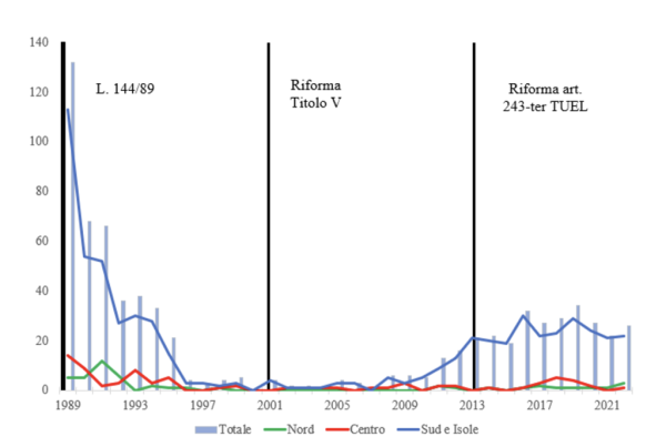 Dal 1989 al 2022, oltre 700 dichiarazioni di dissesto finanziario hanno interessato i comuni italiani di piccole e medie dimensioni (fino a 60.000 abitanti). Si e’ registrata una chiara concentrazione di dissesti tra i comuni del Mezzogiorno con oltre l’80 per cento del totale dei default dichiarati.