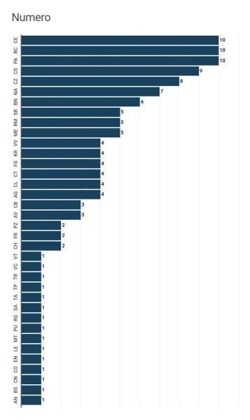 Alla fine del 2020 erano 126 i comuni in dissesto, già sottoposti a un piano di rientro pluriennale. In testa, come si può leggere dal grafico, con 10 comuni a testa troviamo le province di Caserta, Reggio Calabria e Palermo.