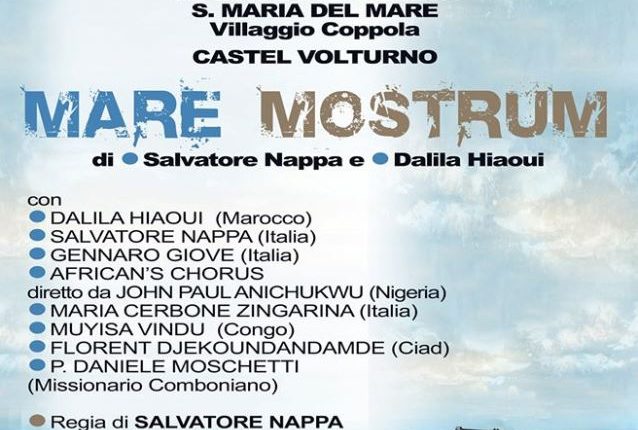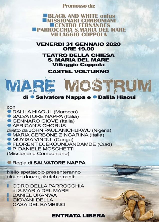 CASTEL VOLTURNO – – Venerdì, 31 gennaio 2020, con inizio alle ore 19:00, presso il Teatro della Chiesa Santa Maria del Mare – Villaggio Coppola in Castel Volturno, con INGRESSO LIBERO, andrà in scena lo spettacolo teatrale “Mare Mostrum” di Salvatore NAPPA e della poetessa DALILA HIAOUI, dalle Associazioni: Black and White Onlus, Missionari Comboniani, Centro Fernandes, Parrocchia Santa Maria del Mare, Villaggio Coppola.