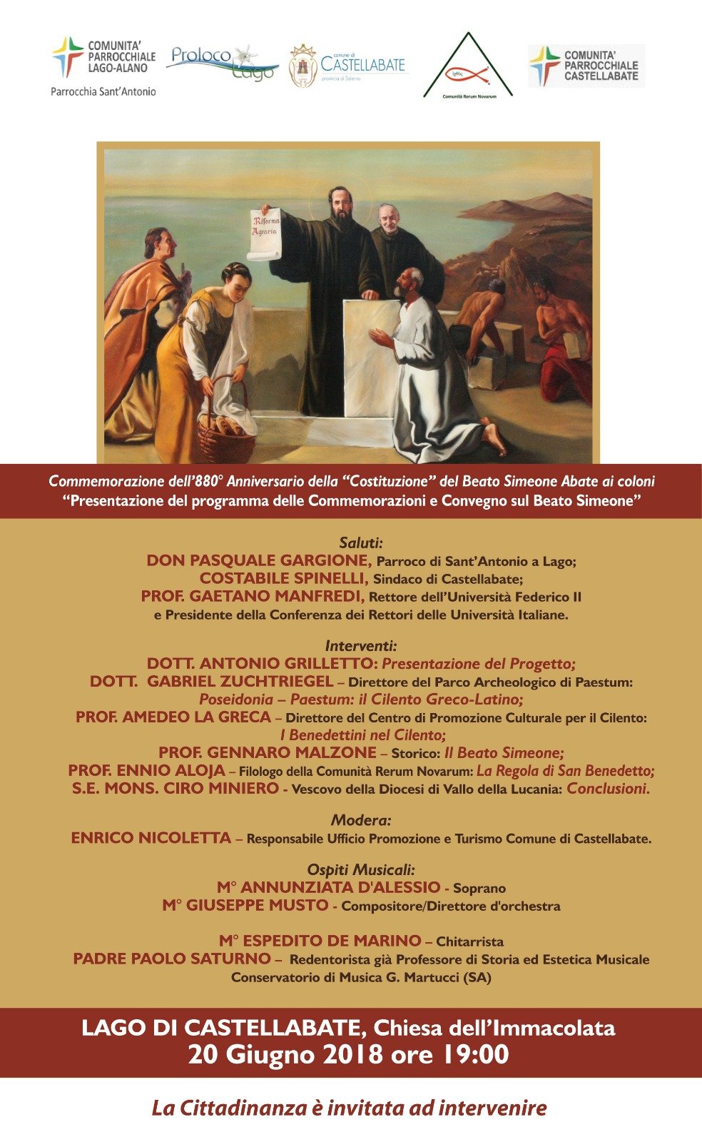 CASTELLABATE – Il Comune di Castellabate in occasione della ricorrenza di quest’anno (1138 – 2018), l’880° anniversario della sottoscrizione dei privilegi concessi ai “Terrazzani” dal Beato Simeone, ha organizzato una serie di iniziative per celebrare il V Abate benedettino, compatrono di Castellabate e successore di San Costabile Gentilcore. Il programma delle commemorazioni è stato illustrato nei minimi dettagli, ieri durante il convegno nazionale, tematico svoltosi nella Chiesa dell’Immacolata – colma come per le grandi occasioni – in località Lago alle ore 19.00, alla presenza del Vescovo S.E. Monsignor Ciro Miniero. L’iniziativa coordinata dal dottor Antonio Grilletto, in collaborazione con i Parroci Don Pasquale Gargione della Parrocchia S. Antonio al Lago e Don Roberto Guida della Parrocchia Castellabate, intende sviluppare alcuni appuntamenti culturali per celebrare la figura del Beato Simeone, artefice della bonifica e dello sviluppo agricolo del “Laris” l’attuale frazione Lago, mediante l’acquisto di terre dai feudatari per liberare i contadini dalle loro angherie e servitù. Al tavolo dei relatori hanno preso parte inoltre il Prof. Ennio Aloja della comunità laica cristiana Rerum Novarum, i professori Gennaro Malzone e Amedeo La Greca (storici), nonché il direttore del Parco Archeologico di Paestum Gabriel Zuchtriegel. Il convegno è stato introdotto da Don Pasquale Gargione che ha ringraziato in modo particolare Filippo Russo, Presidente della Pro Loco Lago cui hanno fatto seguito i saluti di Costabile Spinelli, primo cittadino di Castellabate e del Prof. Gaetano Manfredi, Magnifico Rettore della Università degli studi di Napoli Federico II e Presidente della CRUI. La conduzione è stata affidata a Enrico Nicoletta responsabile del turismo del Comune di Castellabate. Per l’occasione è stato presentato anche il Comitato Tecnico – Scientifico che sosterrà col proprio operato il progetto. Per l’occasione particolarmente toccanti momenti musicali, con componimenti all’uopo composti, che hanno visto la partecipazione straordinaria del Soprano Annunziata D’Alessio, accompagnata al violino dal Maestro Giuseppe Musto (compositore e direttore d’orchestra). “Intendiamo fare memoria dell’apporto offerto dal Beato Simeone ai principali momenti della storia del nostro territorio attraverso una serie di iniziative che si concluderanno il prossimo 16 novembre, in concomitanza con la Festività a lui dedicata” –commenta il Sindaco Costabile Spinelli – “si parte con un interessante convegno che vedrà la partecipazione di importanti personalità del mondo della cultura e religioso per proseguire, nelle prossime occasioni, con altre attività correlate quali la processione delle Sante Reliquie provenienti dall’Abbazia benedettina di Cava dei Tirreni e la pubblicazione di un testo dedicato alla vita e alle opere del Beato”.