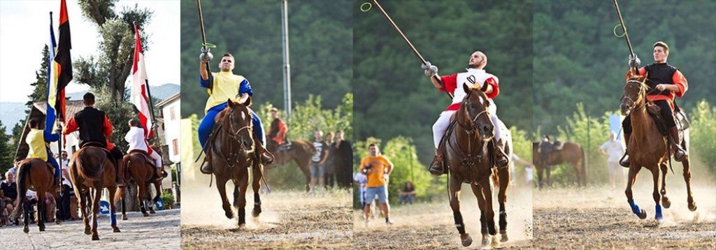 : la melodia dei flauti e dei liuti, la potenza delle cornamuse e dei tamburi, vicolo dopo vicolo, accompagnano il visitatore dalla Chiesa del Purgatorio, posta sull’antica mulattiera, fino alla Torre Grande e al “Giardino degli Artisti”, piccolo museo a cielo aperto, scrigno di tesori dell’arte locale, dalla pittura alla scultura e all’artigianato tipico. Tutto il percorso è contrassegnato dai banchetti contradaioli e dai bancaregli, con degustazione dei prodotti tipici. Fino a tarda notte, il visitatore può gustare menù di pietanze preparate secondo tradizione, in un itinerario gastronomico, dove si respira una sfida nella sfida, a colpi di prelibatezze, tra le varie contrade animate per l’occasione da canti e balli. La domenica, dopo l’aperitivo di mezzogiorno a base di ippocrasso, prosegue nel pomeriggio con il corteo storico organizzato dai cittadini castellani, quest’anno accompagnati dagli sbandieratori di Sessa Aurunca. Tutto culmina con l’atteso torneo, dove i tre cavalieri, armati di lunghe lance, si sfidano al galoppo per centrare gli anelli, posti lungo il nuovo suggestivo campo di gara. La conquista dello stendardo è il preludio per la proclamazione della contrada reggente, al fianco del Signore del Castello, e per il banchetto finale, in onore del vincitore. Il torneo del 2017 è stato vinto dalla contrada Platano, che vanta il maggior numero di vittorie, a conferma della forte e radicata tradizione dei propri fantini. La manifestazione è organizzata dall’Associazione Culturale Cluvia, che negli anni gode sempre più del supporto della popolazione: quasi la metà del paese è coinvolta nell’organizzazione e nell’allestimento dell’evento. Il sindaco di Castello del Matese, Antonio Montone, ci tiene anche quest’anno a ringraziare l’Associazione e i suoi concittadini “per il costante impegno organizzativo, che permette al nostro paese di rinnovarsi ogni anno nello spirito gioioso e accogliente che l’ha sempre contraddistinto” e invita tutti a una partecipazione “spensierata e conviviale”. Il presidente dell’Associazione Cluvia, Michele Granitto, sottolinea con soddisfazione la crescente curiosità dei visitatori verso la manifestazione, evidenziando un approccio sempre più esigente da parte di tutti coloro che partecipano alla festa: “noi cerchiamo di stare al passo senza snaturare l’anima della Giostra, in perenne equilibrio tra tradizione e rinnovamento, come in fondo è stato lo spirito medievale”.