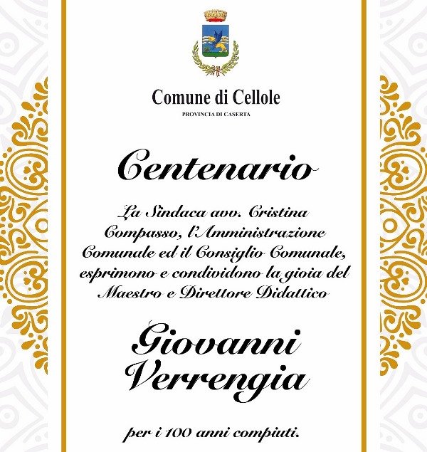 CELLOLE – L’Amministrazione comunale di Cellole, guidato dal Sindaco Cristina Compasso, ha festeggiato i primi cento anni del professore Giovanni Verrengia che fu il primo consigliere eletto nelle prime elezioni libere del 1946