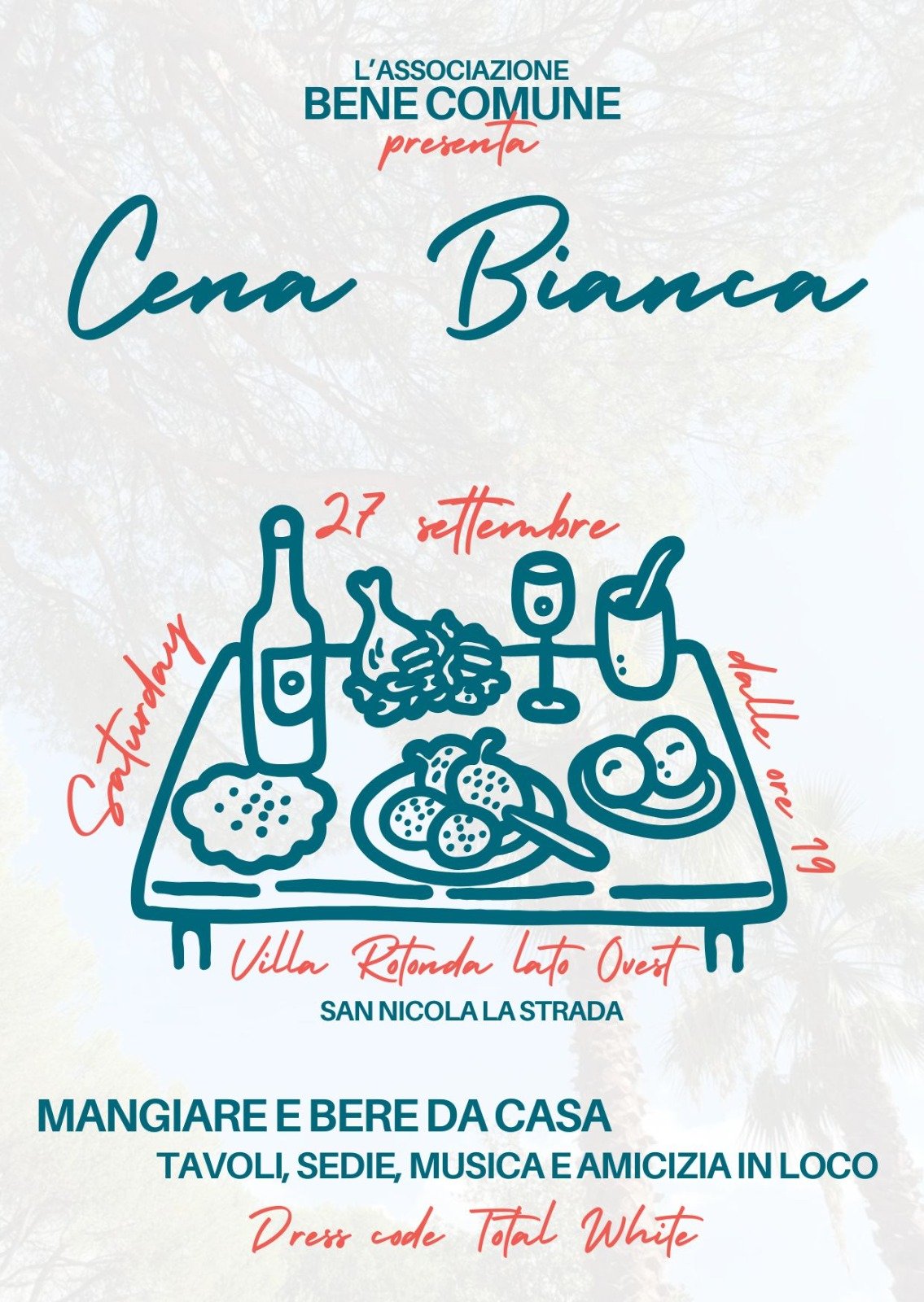 Sabato 27 settembre, dalle ore 19:00, nell’emiciclo Ovest della Rotonda di San Nicola La strada, si terrà la manifestazione “CENA BIANCA”. L’organizzazione è a cura dell’Associazione Bene Comune, che ha sede in Viale Carlo III n. 150 presso il Centro Studi Don Milani.