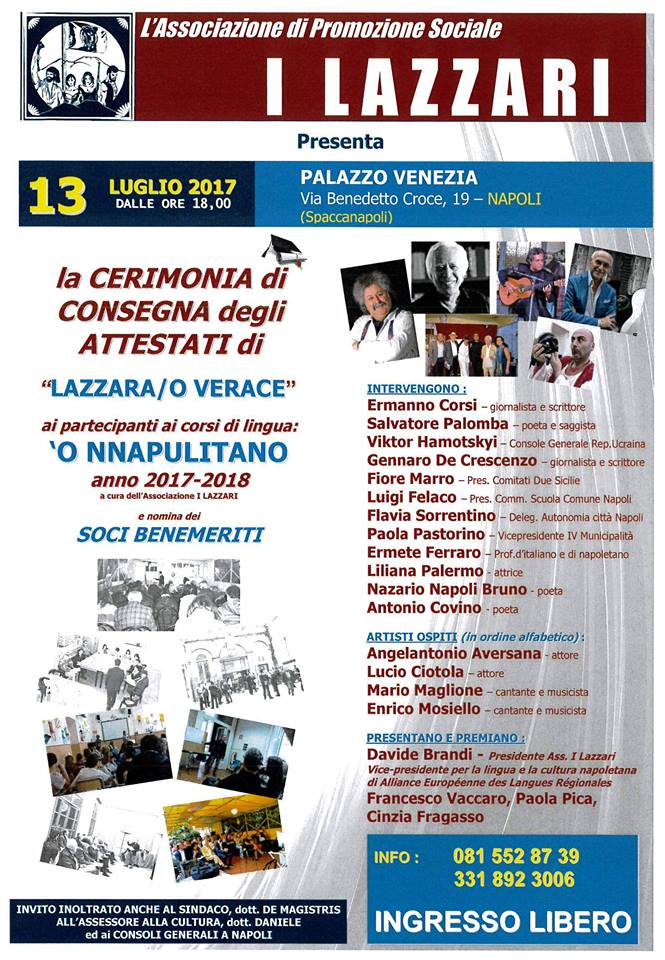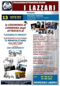 Anche quest’anno, dunque, si terrà la CERIMONIA di consegna degli ATTESTATI di “LAZZARA/O VERACE” a tutti i partecipanti ai corsi (tenuti a Palazzo Venezia) da settembre 2017 a tutto giugno 2018. Nell’occasione saranno consegnate ufficialmente le nomine ai soci benemeriti dell’Associazione di Promozione Sociale I LAZZARI. All’evento interverranno il giornalista Ermanno Corsi, il poeta Salvatore Palomba, il presidente del Movimento Neoborbonico, prof. Gennaro De Crescenzo, il presidente dei Comitati Due Sicilie, Fiore Marro. Interverrà anche il Comune di Napoli nelle persone di Luigi Felaco, consigliere e presidente della Commissione Scuola, di Flavia Sorrentino, delegata Autonomia Città di Napoli, di Paola Pastorino, vice-presidente IV Municipalità. L’invito, ovviamente, è stato inoltrato anche al Sindaco nonché all’Assessore alla Cultura, Nino Daniele. Interverranno inoltre, il poeta Nazario Napoli Bruno, l’attrice Liliana Palermo, il prof. Ermete Ferraro, il poeta Antonio Covino, l’attore Franco Gargia oltre a tante altre piacevoli sorprese.