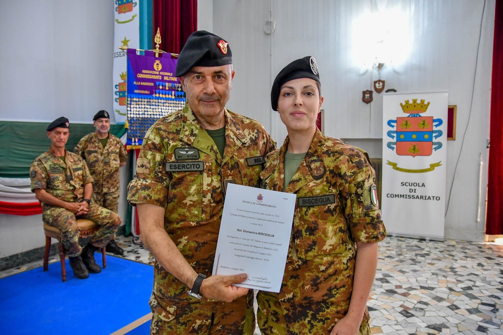 L’evento, che si è svolto alla presenza del Direttore dell’Ufficio Centrale del Bilancio e degli Affari Finanziari della Difesa e Capo del Corpo di Commissariato dell’Esercito, Ten. Gen. Stefano REGA, e dal Comandante della Scuola, Brigadier Generale Sandro Corradi, ha visto la partecipazione di rappresentanti dell’Associazione Nazionale Commissariato Militare (ANACOMI), di familiari dei Volontari e di una rappresentanza del personale militare dell’Istituto. In tale occasione, sono stati conferiti i copricapo di specialità ai primi classificati di ciascun corso.