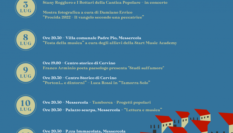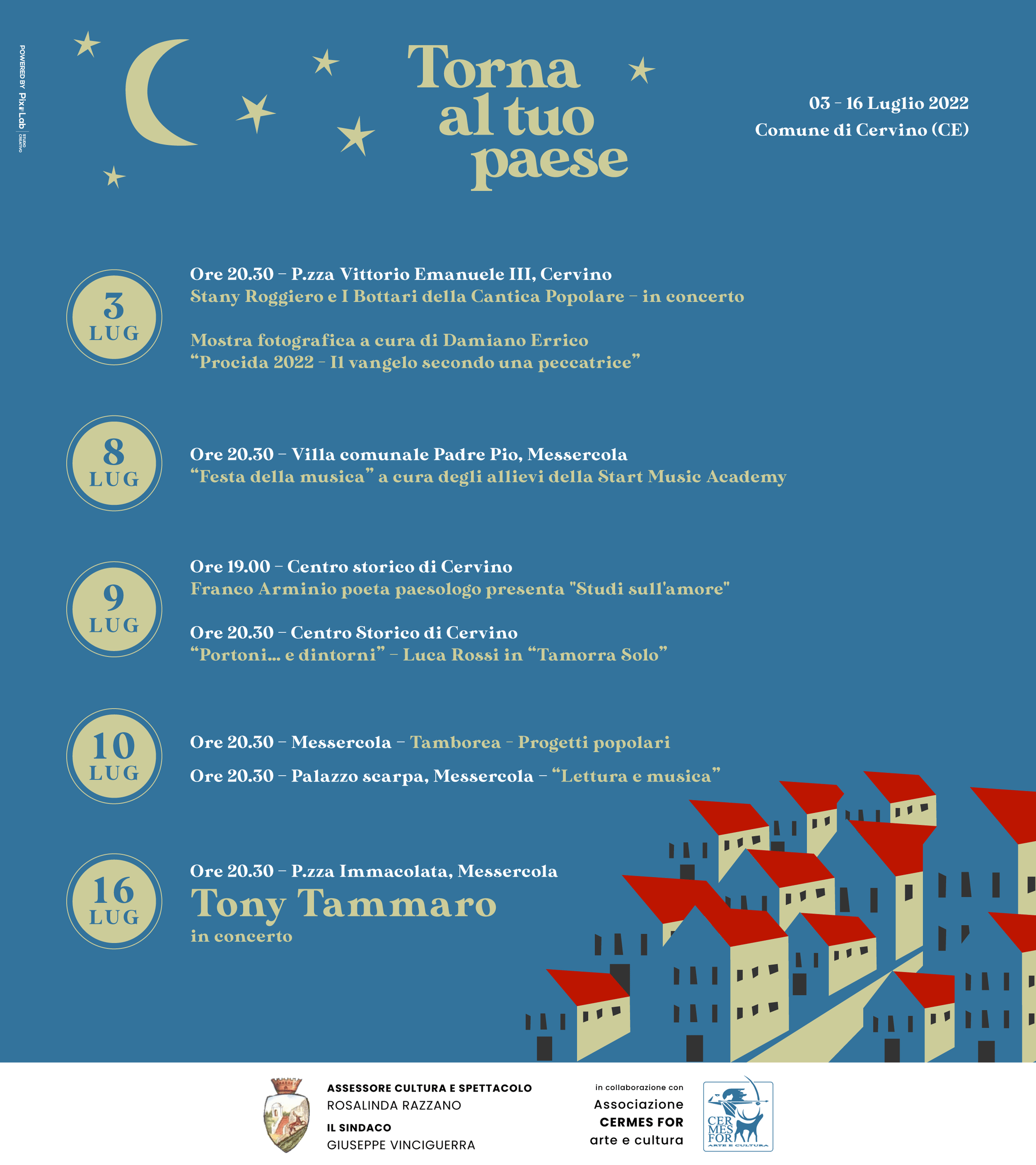 Illustrato il programma ufficiale della kermesse estiva “Torna al tuo paese”: ieri, mercoledì 29 giugno, la conferenza stampa di presentazione nel Municipio di Cervino, trasmessa sulla pagina Facebook dell’Amministrazione Comunale. Sono intervenuti il sindaco Giuseppe Vinciguerra, l’assessore alla Cultura e allo Spettacolo Rosalinda Razzano e Maria Rosaria Iaderosa, membro di CerMes For “Arte e Cultura”, Associazione socioculturale co-organizzatrice degli eventi. La programmazione rientra in un progetto integrato di filiera turistica per Enti locali, approvato e finanziato dal POC Campania 2014/2020, volto alla realizzazione di “Percorsi turistici di tipo culturale, naturalistico ed enogastronomico di portata nazionale e internazionale”. Il calendario, concentrato esclusivamente nel mese di luglio, prenderà il via domenica 3, alle ore 20.30, in Piazza Vittorio Emanuele III, con il concerto di Stany Roggiero e la musica de I Bottari della Cantica Popolare, nella cornice di una mostra fotografica, a cura di Damiano Errico, dal titolo “Procida 2022 – Il vangelo secondo una peccatrice”. Seguirà un intero fine settimana caratterizzato dai seguenti appuntamenti: venerdì 8 luglio, alle ore 20.30, nella Villa comunale “Padre Pio”, a Messercola, spazio alla “Festa della musica”, a cura degli allievi della Start Music Academy; sabato 9 luglio, doppia performance, nel centro storico di Cervino capoluogo, alle ore 19.00 e alle ore 20.30, rispettivamente con la presentazione di “Studi sull’amore”, a cura del poeta paesologo Franco Arminio, e l’esibizione di Luca Rossi in “Tamorra Solo”, nell’ambito di “Portoni…e dintorni”; si proseguirà domenica 10 luglio, a Messercola, alle ore 20.30, con il “Teatro popolare di tradizione folklorica” e, all’interno di Palazzo Scarpa, con “Letture e Musica”. Serata conclusiva fissata a sabato 16 luglio, alle ore 20.30, quando Tony Tammaro chiuderà il ciclo di eventi con un concerto in Piazza Immacolata. “Abbiamo sviluppato concretamente l’idea – hanno dichiarato l’assessore Razzano e il Primo Cittadino – di procedere con una raccolta di generi e preferenze, sul piano culturale, artistico e musicale, capaci di abbracciare i gusti e gli interessi di una vasta platea, rispondendo alle esigenze dei nostri concittadini e delle comunità limitrofe. In particolare, è stata una precisa scelta dare spazio agli artisti che, nei loro rispettivi campi, abbiano saputo tenere fede alle tradizioni popolari, portando le loro abilità non solo sulla scena locale e regionale, ma anche italiana e internazionale. Siamo orgogliosi di questa intensa kermesse, realizzata in collaborazione con l’associazione CerMes, che mira non solo a promuovere il nostro territorio da un punto di vista turistico, con un rilancio che non si vedeva da tempo, ma intende, inoltre, offrire alla cittadinanza un intrattenimento a pochi passi da casa, in cui ritrovarsi e trascorrere i primi weekend estivi”.