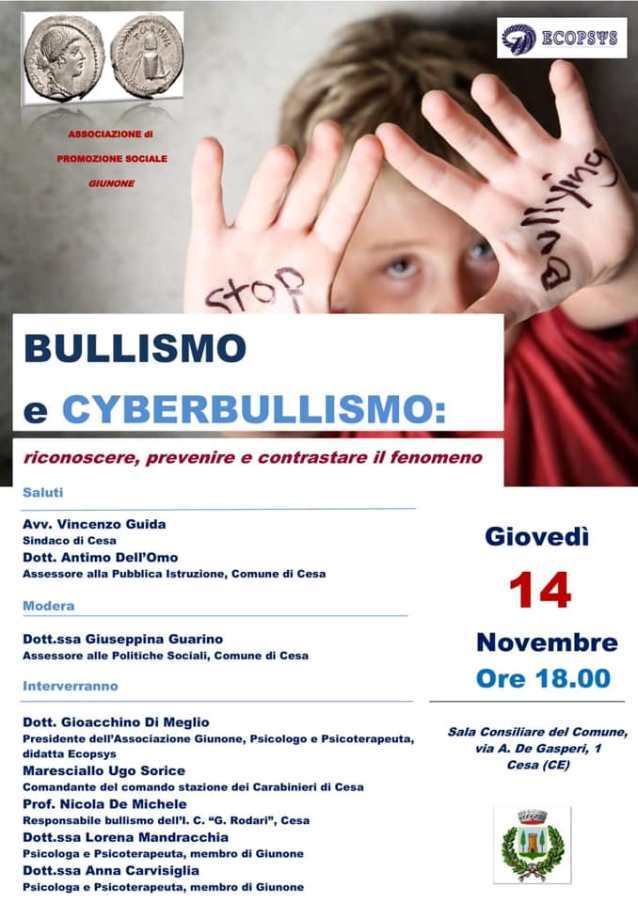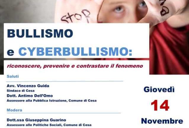 “Bullismo e Cyberbullismo, riconoscere, prevenire e contrastare il fenomeno” è il titolo del convegno che si terrà giovedì 14 novembre 2019, con inizio alle ore 18:00, presso la sala consiliare del Comune di Cesa