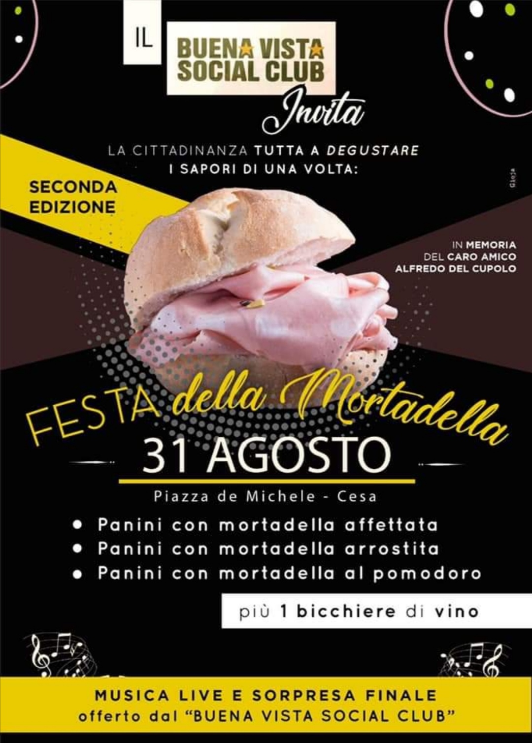 Organizzata dal Buena vista social club, l’ iniziativa é alla sua seconda edizione. Oltre ad assaggi di vari modi di gustare la mortadella, dall’ arrostita a quella condita con pomodori, ci saranno musica e sorprese.