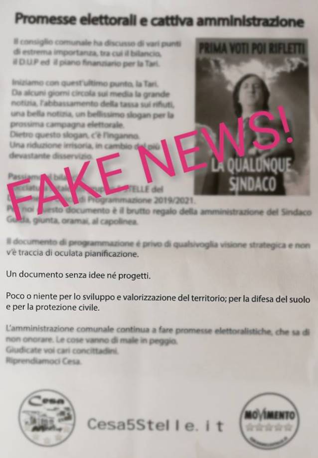 CESA – Riceviamo e pubblichiamo il comunicato stampa fattoci pervenire dell’Assessore alla Protezione Civile del Comune di Cesa, Alfonso Marrandino e relativo ad un volantino diffuso in merito dal Movimento 5 Stella locale: “Nel bilancio non ci sono fondi per la protezione civile”. È una fake news quella diffusa dai 5 Stelle.