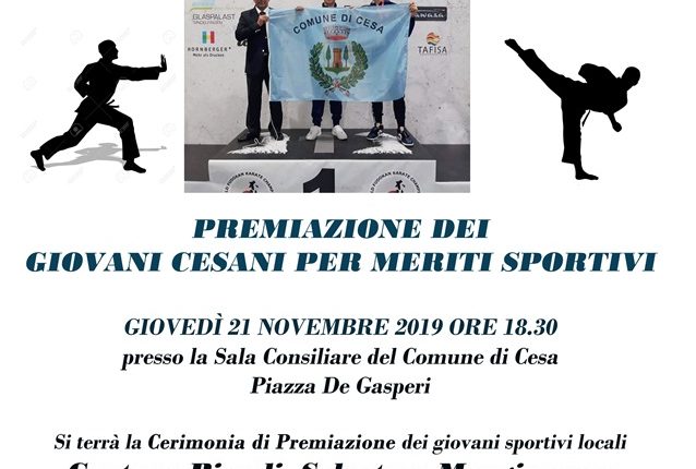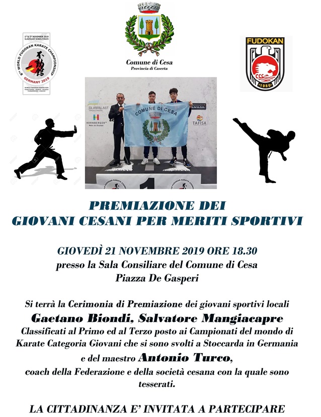 CESA – Si terrà giovedì 21 novembre 2019, con inizio alle ore 18:30, presso la sala consiliare, la premiazione di Gaetano Biondi e Salvatore Mangiacapre. Si tratta dei ragazzi locali che, nelle settimane scorse, hanno trionfato ai Campionati del Mondo di Karate Categoria Giovani, svoltisi a Stoccarda in Germania.