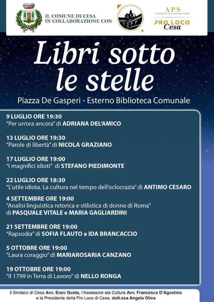 Cesa– Il comune di Cesa, in collaborazione con APS (Associazione di promozione sociale) e Pro loco Cesa darà a breve il via all’interessante rassegna estiva “Libri sotto le stelle”.