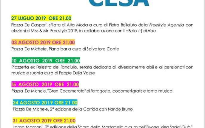 Si parte sabato prossimo di sera, 27 luglio, in piazza De Gasperi, con la sfilata di alta moda a cura di Pietro Bellaiuto di Freestyle Agenzia per la elezione di Miss & Mr Freestyle 2019, con la collaborazione il +Bello (r )di Abe.