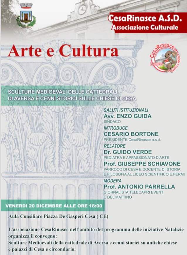 CESA – L’associazione CesaRinasce nell’ambito del programma delle iniziative natalizie ha organizzato per venerdì 20 dicembre 2019, con inizio alle ore 18:00, nell’aula consiliare del comune di Cesa in Piazza De Gasperi, un convegno avente per tema: “Sculture Medioevali della cattedrale di Aversa e cenni storici su antiche chiese di Cesa e circondario”.