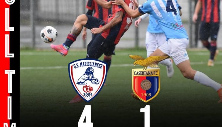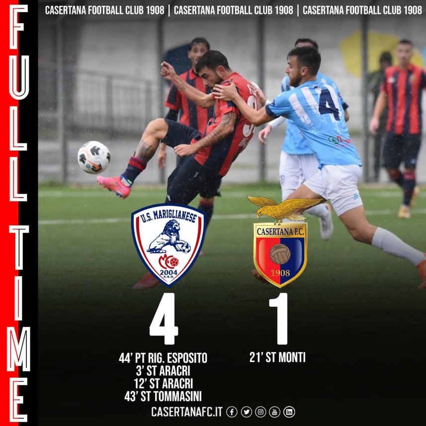 Prima sconfitta stagionale per la Casertana di Maiuri, la squadra rossoblu’ si è dovuta arrendere alla Mariglianese. Finisce 4-1 per la squadra di casa, una sconfitta che costa alla Casertana il primato. Non solo la sconfitta a rovinare i piani anche infortunio prima della gara di Rainone, insomma una giornata decisamente storta per i rossoblu’
