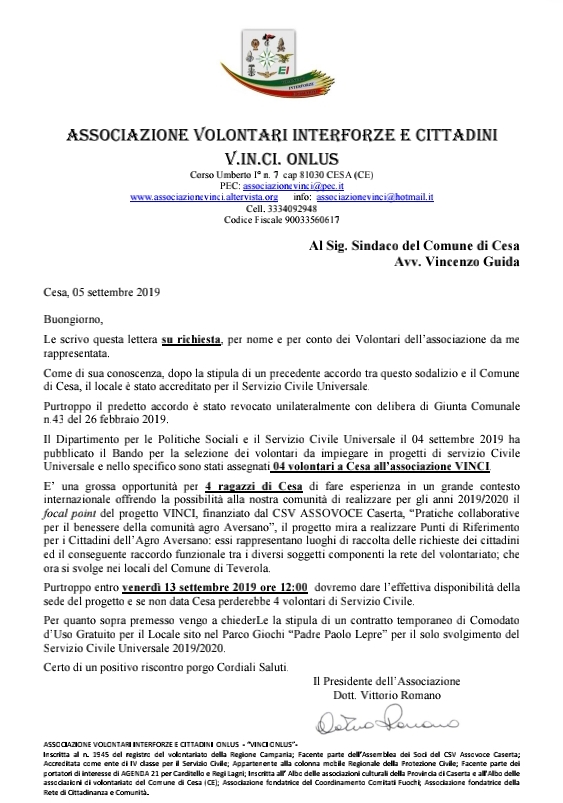 I volontari chiedono la stipula di un contratto di comodato d’uso gratuito per il locale sito nel Parco giochi per lo svolgimento del servizio civile universale 2019/2020 che al momento non è stata concessa.