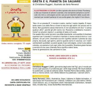 All’incontro con l’Autrice interverranno Raffaele LAURIA, responsabile WWF OA Caserta, e Matteo PALMISANI, delegato LIPU Caserta, con la partecipazione di #FridaysForFuture Caserta. In libreria dal 27 settembre scorso, in occasione dello sciopero mondiale per il clima, #GlobalClimateStrike, è il primo testo illustrato dedicato a Greta Thunberg, la giovane paladina della lotta ai cambiamenti climatici che qui diventa un’alunna della scuola primaria: per ispirare i suoi coetanei a diventare #GreenHeroes, supereroi per la Terra.