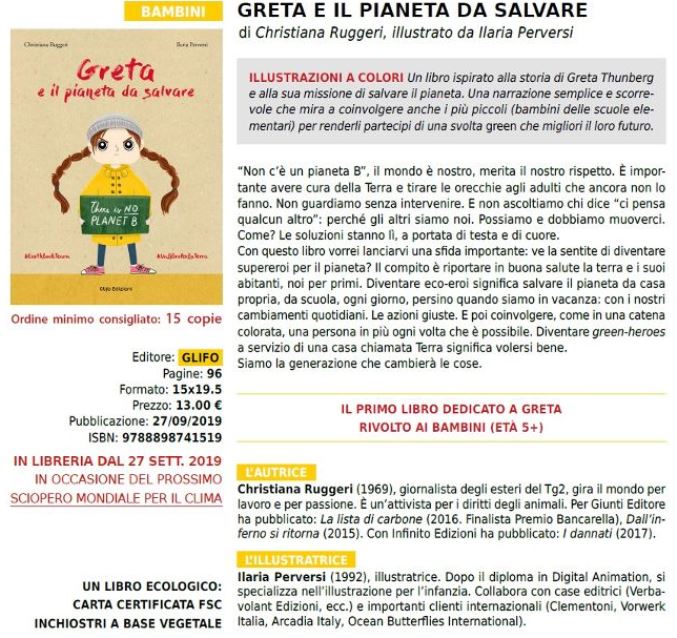Il testo è ecologico, con carta certificata FSC (Forest Stewardship Council), ha la copertina di scarti di mais e utilizza inchiostri a base vegetale. Le illustrazioni sono di Ilaria Perversi ed è pubblicato da Glifo Edizioni (sul sito: http://www.glifo.com/it/shop/75-christiana-ruggeri-ilaria-perversi-greta-e-il-pianeta-da-salvare). Per entrare nella “Squadra del Libro per la Terra”, acquistare il testo e organizzare incontri ed eventi ci sono varie opzioni: andare in libreria, scrivere all’email EarthBookTeam@gmail.com per qualsiasi info (mamme, papà e scuole) e ordini; seguire la pagina Facebook Earth Book Team, La squadra del libro per la terra (https://facebook.com/EarthBookTeam/), dedicata al libro e al suo progetto #UnAlberoUnaScuola, oltre a tanti consigli green, sempre aggiornati.