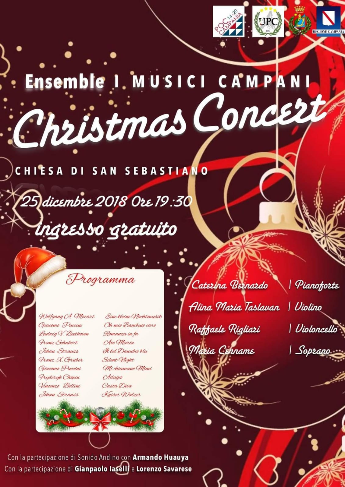 L’ensemble I MUSICI CAMPANI si esibirà domani 25 dicembre alle 19:30 nella Chiesa di San Sebastiano a Caserta per un grande Christmas Concert. Un programma vario, famoso ed emozionante sarà eseguito da questi grandi artisti: Caterina Bernardo, direttore artistico, al pianoforte; Alina Maria Taslavan al violino; Raffaele Rigliari al violoncello; Maria Cenname come soprano. Sarà ospite SONIDO ANDINO, con Armando Hauaya, con musica andina, come la stessa Caterina Bernardo ha detto, “per aprire il cuore all’unione e all’uguaglianza”.