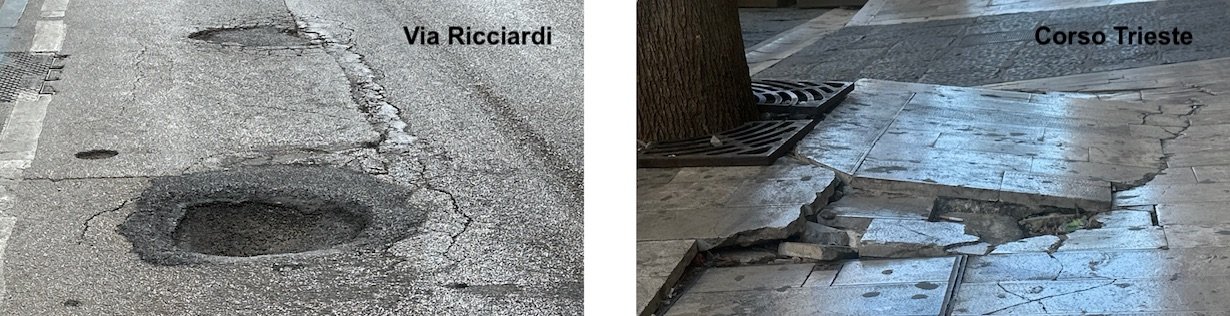 I cittadini lo dicono da tempo: il pericolo è per tutti, nessuno escluso. Lo ricordano le immagini scattate dalla nostra redazione questa mattina in Via Ricciardi e in Corso Trieste.