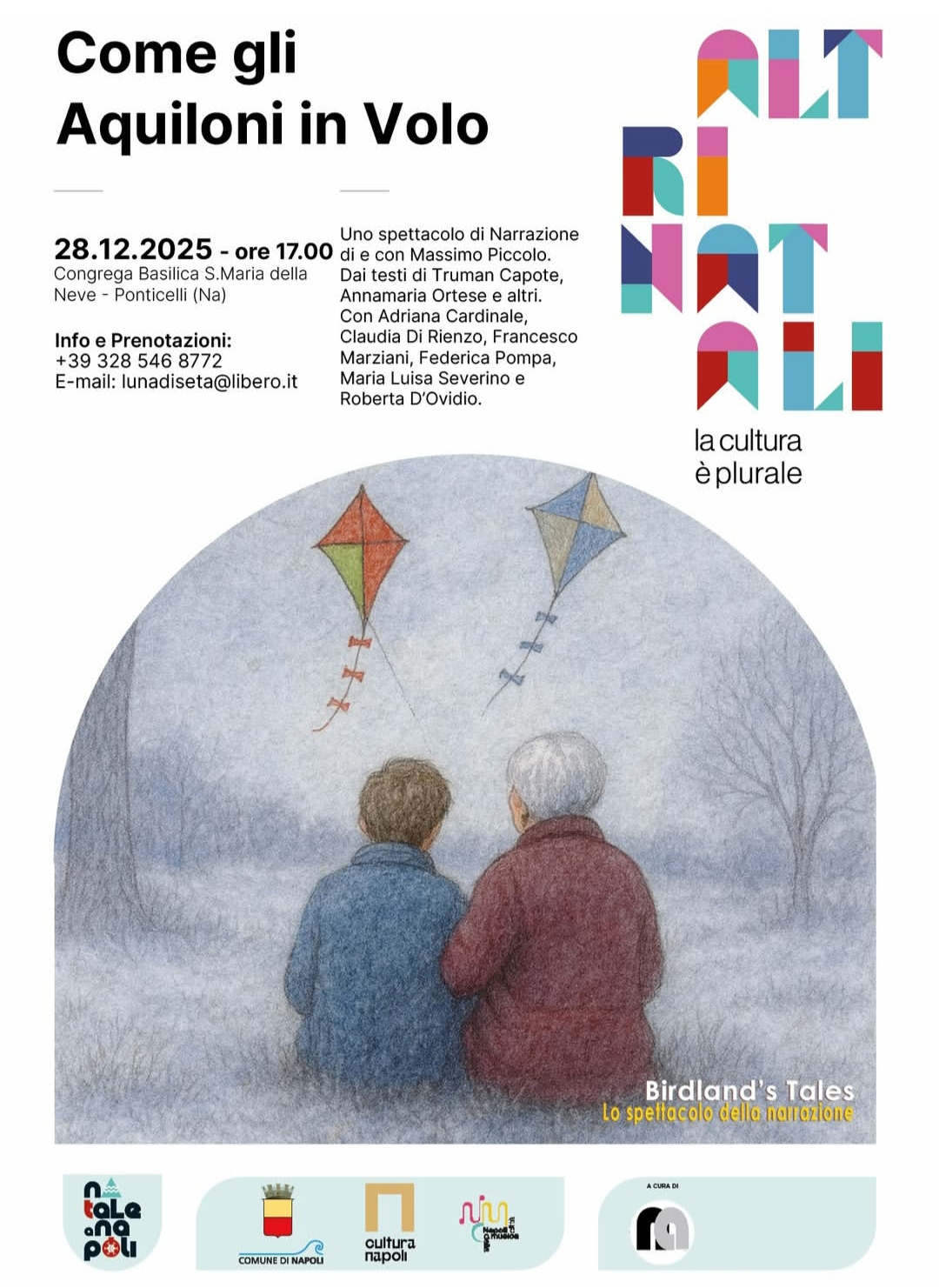 Birdland’s Tales torna con un nuovo capitolo dedicato al Natale e alla sua magia più intima, nell’ambito della rassegna “Altri Natali 2025”. Domenica 28 dicembre 2025, nella Congrega della Basilica di Santa Maria della Neve, in Piazza Vincenzo Aprea 2 a Ponticelli (Na), alle ore 17.00, sarà di scena lo spettacolo di narrazione “Come gli aquiloni in volo” di e con Massimo Piccolo.