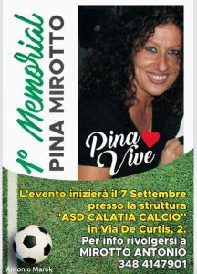 “Pina vive” lo slogan scelto dal fratello Antonio, anima e deus ex machina del I memorial “Pina Mirotto” che ha fischiato il calcio di inizio ieri alle 22.00 al campo ASD Calatia di Enzo Sivo in via De Curtis a Maddaloni.