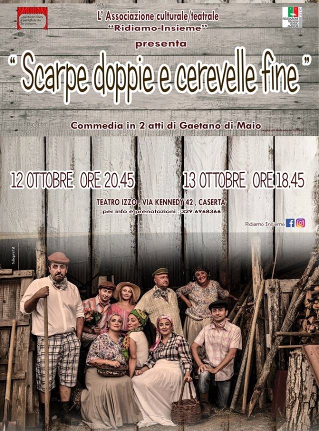 Doppio appuntamento a Caserta con la compagnia teatrale di Casagiove “Ridiamo insieme” di Salvatore Vitale, presidente dell’associazione culturale/teatrale “Ridiamo Insieme”, che porterà in scena un nuovo lavoro dal titolo “Scarpe doppie e cerevelle fine” di Gaetano Di Maio. Il primo appuntamento, che si terrà al Teatro Izzo in Via Kennedy nr. 42 a Caserta, è in programma per sabato 12 ottobre 2019, sipario alle ore 20:45, mentre il secondo appuntamento è previsto per le ore 18:45 del giorno successivo, domenica 13 ottobre 2019.