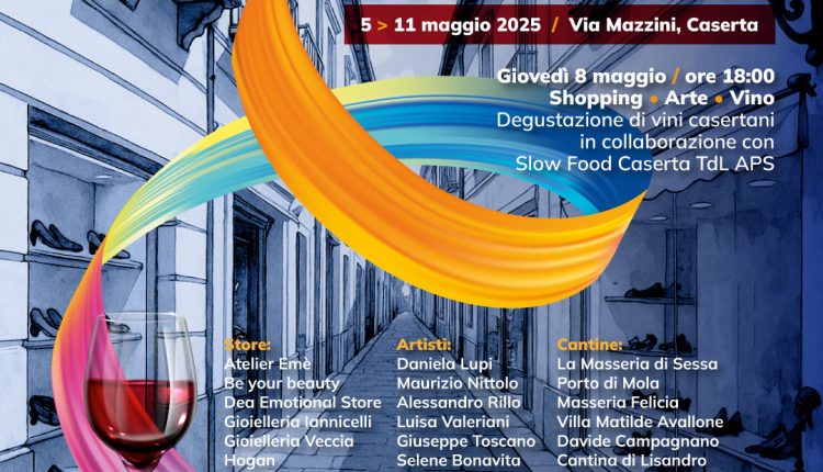 “Sorsi d’Arte” farà incontrare shopping, arte e vino da lunedì 5 a domenica 11 maggio nel cuore della città di Caserta, in via Mazzini, a due passi dalla Reggia. Il momento clou, ovvero il main event di tutta la rassegna, sarà giovedì 8 maggio con degustazioni e incontri con gli artisti.