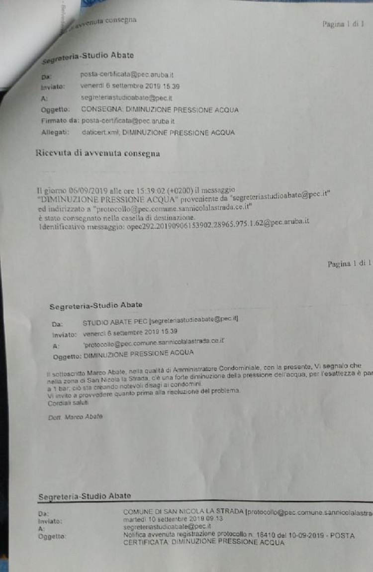 I condomini del predetto Parco MECOS avevano lamentato già dallo scorso mese di settembre 2019, che erano mesi che l’acqua non arrivava ai piani superiori al primo nelle ore di punta a causa di una scarsa pressione che non superava 1.2 bar. L’Amministratore condominiale, avvocato Marco ABBATE, interessò già allora l’Amministrazione comunale, guidata dal Sindaco Vito MAROTTA, con PEC.