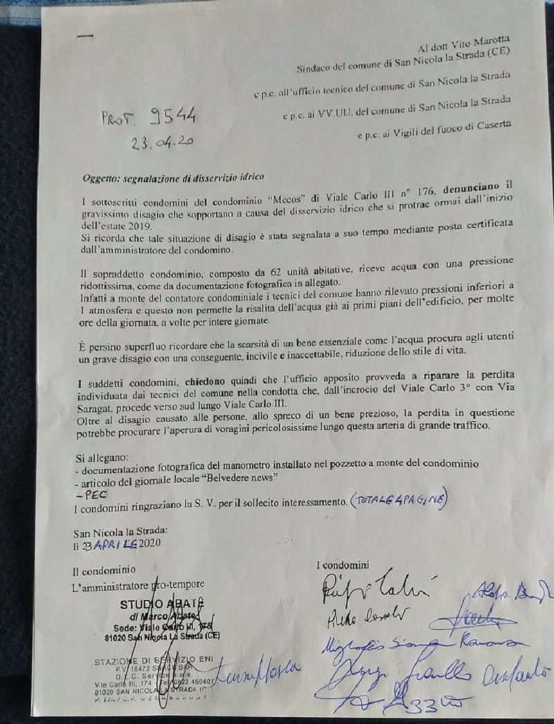 Con la nota prot. nr. 9544 in data 23 aprile 2020, i condomini hanno inviato una ulteriore “Segnalazione di disservizio idrico”, allegando la documentazione fotografica del “manometro” installato nel pozzetto a monte del condominio e la pec dello scorso mese di settembre 2019. Oltre al grave disagio causato alle 62 unità abitative ed alle persone, allo spreco di un “bene prezioso come l’acqua”, la perdita in questione potrebbe procurare l’apertura di voragini pericolosissime proprio a ridosso del Viale Carlo III^, la grande arteria stradale percorsa quotidianamente da decine di migliaia di auto.