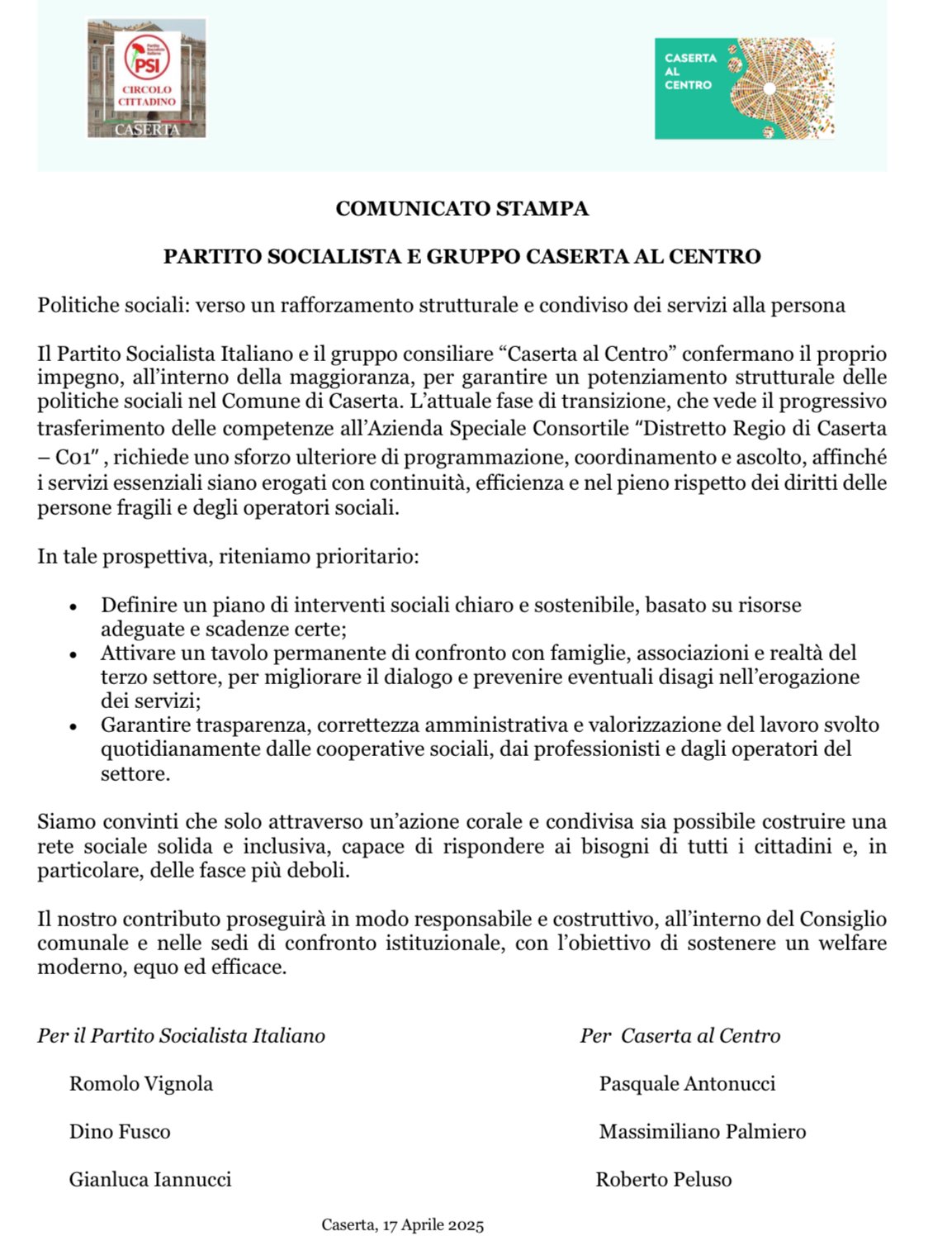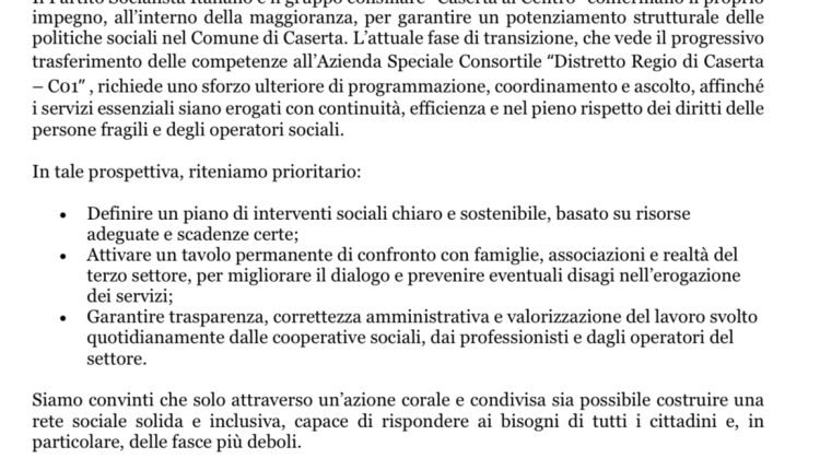 Il Partito Socialista Italiano e il gruppo consiliare “Caserta al Centro” confermano il proprio impegno, all’interno della maggioranza, per garantire un potenziamento strutturale delle politiche sociali nel Comune di Caserta. L’attuale fase di transizione, che vede il progressivo trasferimento delle competenze all’Azienda Speciale Consortile “Distretto Regio di Caserta – C01” , richiede uno sforzo ulteriore di programmazione, coordinamento e ascolto, affinché i servizi essenziali siano erogati con continuità, efficienza e nel pieno rispetto dei diritti delle persone fragili e degli operatori sociali.