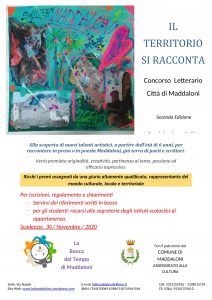 La Banca del Tempo comunica a tutti i cittadini simpatizzanti che l’ associazione, per i motivi a tutti noti legati alla pandemia, rinvia al 30 novembre 2021 la chiusura del concorso di poesia e prosa indetto per quest’anno e avente come titolo “Il Territorio si racconta” (si allega la locandina originale).