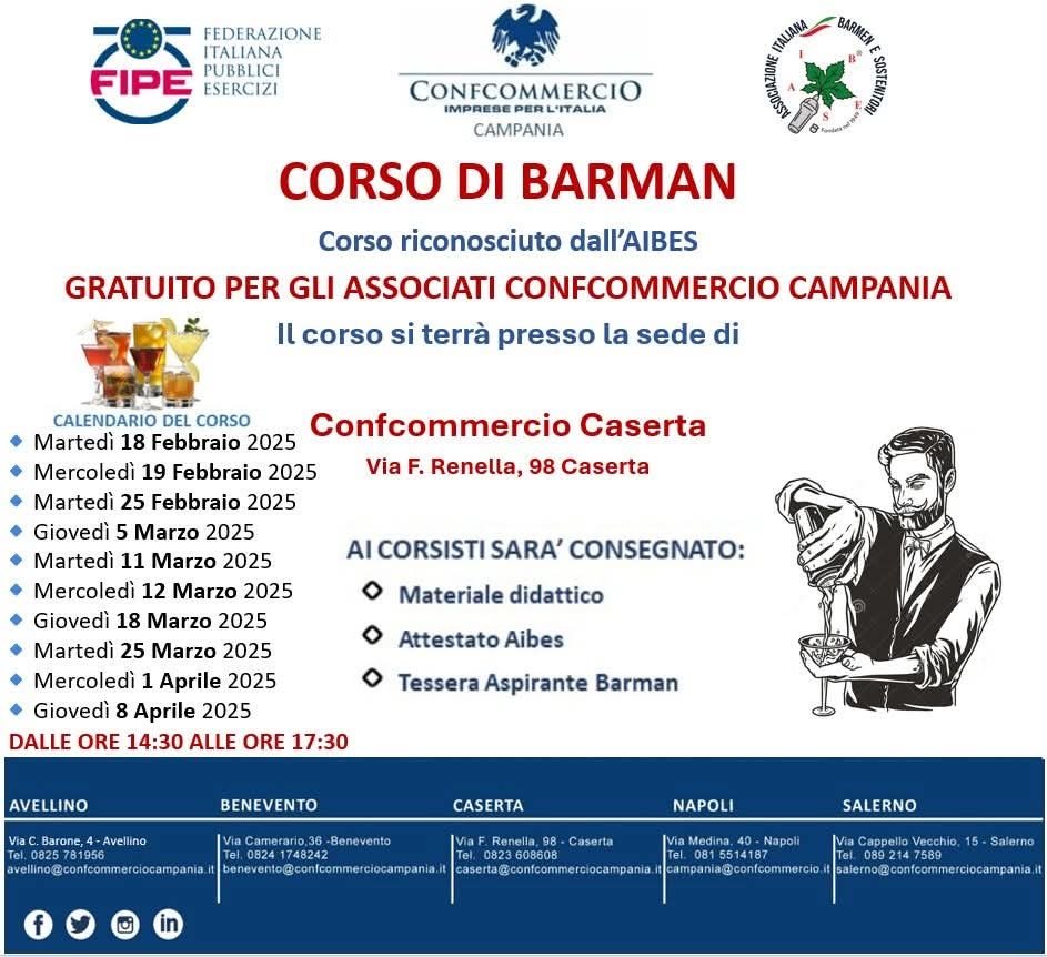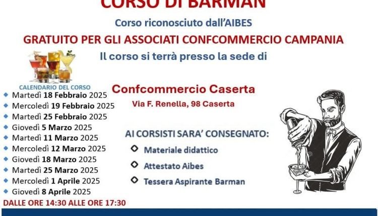 rtirà martedì 18 febbraio l’atteso corso di Barman per i soci di Confcommercio Caserta. Dieci lezioni gratuite in programma fino all’8 aprile che si svolgeranno nella sede di via Renella a Caserta dalle ore 14,30 alle 17,30. Si tratta di un percorso finalizzato a fornire gli elementi cardine della professione durante il quale i corsisti potranno iniziare ad orientarsi nel mondo della miscelazione, imparando a riconoscere qualità e dosi di un cocktail o di un long drink, a utilizzare l’attrezzatura nel modo corretto o a scegliere il bicchiere più adatto a seconda della bevanda, diventando così esercenti più consapevoli e consumatori più informati. Prevista la partecipazione di un massimo di due dipendenti per azienda. Ai corsisti sarà consegnato il materiale didattico, l’attestato Aibes (Associazione italiana barman) e la tessera di aspirante Barman. ‘L’associazione di categoria – fa sapere Maria Russo, coordinatrice provinciale di Confcommercio Caserta – offre non solo assistenza e servizi alle imprese associate ma anche una formazione costante su tutto ciò che può aiutare le imprese ad essere com-petitive sul mercato del lavoro e un aggiornamento professionale che consente di mi-gliorare le competenze e la qualità dei servizi offerti da ciascuna realtà imprenditoria-le. Dagli strumenti di marketing alle nuove tecnologie digitali, passando per l’apprendimento delle lingue straniere e il corso di sommelier. E non solo’.