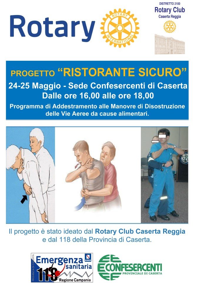 “Una delle cause più frequenti di soffocamento- continua Giuseppe Vecchione Presidente Rotary Club Caserta Reggia – è l’ostruzione delle vie aeree dopo introduzione di cibo nella cavità orale, il normale, banale atto del mangiare! Se una campagna di educazione alle famiglie esula dai compiti di questa Associazione e ricade invece come responsabilità sulle Istituzioni Sanitarie a vari livelli, è invece già un piccolo ma significativo contributo quello di preparare un piano di addestramento del personale impiegato a vario titolo nella ristorazione per far sì che si possano affrontare e risolvere quelle situazioni di emergenza che altrimenti porterebbero a probabile morte di individui di tutte le età e a sicuri danni di immagine, oltre che morali, per i ristoratori che avessero la sfortuna di ospitare tragici casi del genere”.