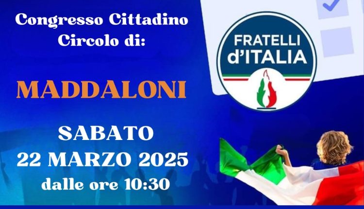 Maddaloni- Si terrà domani mattina, sabato 22 marzo alle ore 10.30 , il congresso cittadino di Fratelli d’Italia , presso la sede della biblioteca comunale, già sede del liceo classico Giordano Bruno, sala Bruno Iorio, Maddaloni. L’organizzazione a cura dei dirigenti locali in collaborazione con Dipartimento Provinciale .