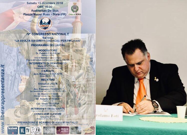 SORA. Si avvicina il IV° congresso dell’associazione culturale “Libera Rappresentanza”. L’evento, in programma il prossimo 15 dicembre, alle ore 16:00, presso l’Auditorium De Sica (piazza Mayer Ross) in Sora e organizzato dal movimento, è incentrato sul tema “La svolta sui diritti sindacali per i militari”.