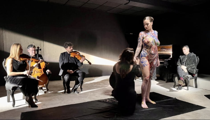 Nel cuore dello spazio creativo di Titti Petrucci, che si è trasformato in un palcoscenico, la bellissima performance di body painting della Belmonte. Un binomio importante che ha enfatizzato due elenti necessari, estetica e racconto. Protagoniste dell’evento sono state l’artista Vivian Belmonte e la performer Marika Gambardella, conosciuta dal grande pubblico per il ruolo di Luna nella serie Mare Fuori. La performance non è stata una semplice esibizione artistica, ma un vero dialogo tra corpo e materia. Vivian Belmonte, nota per il suo approccio sensibile e quasi narrativo al body painting, ha utilizzato il corpo di Marika Gambardella come tela viva, costruendo un’opera stratificata fatta di simboli marini, richiami alla libertà e suggestioni emotive. Il riferimento al personaggio di Luna – figura intensa e fragile allo stesso tempo – è emerso gradualmente: linee fluide, tonalità acquatiche e dettagli luminosi hanno evocato il legame profondo con il mare, elemento centrale anche nella serie che l’ha resa celebre. Se sullo schermo Marika Gambardella incarna la complessità di Luna, dal vivo ha dimostrato una straordinaria capacità performativa. Immobile e concentrata, ha lasciato che ogni gesto dell’artista diventasse parte di una coreografia silenziosa. L’ambiente ideato da Titti Petrucci ha giocato un ruolo fondamentale. Più che una cornice, lo showroom si è rivelato un contenitore dinamico dove moda e arte si incontrano. Luci soffuse, materiali ricercati e un’atmosfera intima hanno contribuito a trasformare la performance in un’esperienza immersiva per il pubblico. Più che un evento effimero, la performance ha lasciato un segno nel pubblico presente, offrendo una riflessione sulla bellezza, sulla trasformazione e sul potere evocativo dell’arte. In un’epoca in cui le immagini scorrono veloci, momenti come questo riescono ancora a fermare lo sguardo e a restituire profondità all’esperienza estetica. Da pochi giorni Vivian ha terminato un nuovo progetto audiovisivo, con l’intento di dare ancora una volta forma e respiro a Verba Velata, un progetto che continua a crescere e a trasformarsi. Un percorso fatto di immagini, suoni e presenza, dove ogni elemento contribuisce a costruire un’atmosfera sospesa e intensa. Le musiche di Nico Giordano, accompagnate dal violino di Antonella De Chiara , dal violoncello di Pasquale Termini e dal pianoforte di Luca Mennella. La voce e l’interpretazione sono affidate a Massimo De Matteo, attore napoletano capace di dare profondità e vibrazione al testo. Fondamentale anche il lavoro di Clara Langella come assistente, insieme alla presenza scenica della modella storica di Verba Velata, Giovanna Siena. Alla parte visiva, fotografia e regia di Davide Scognamiglio, produzione e post produzione di Elio Di Pace. Un progetto corale, fatto di incontri, ricerca e sensibilità diverse, che presto prenderà forma definitiva.