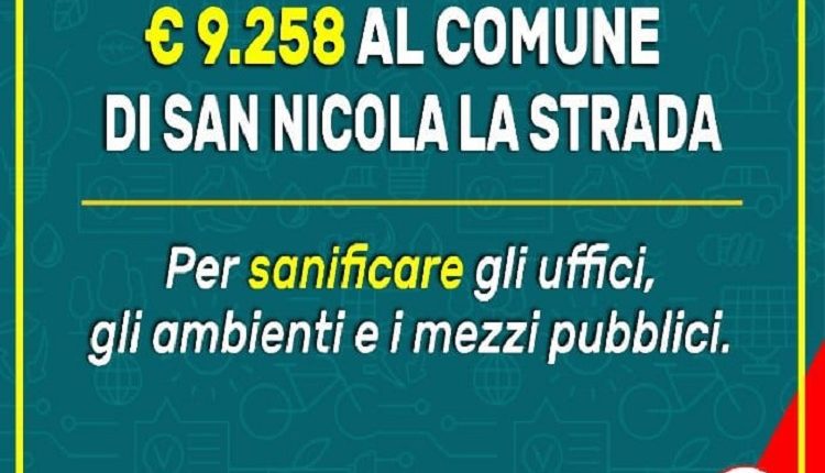 SAN NICOLA LA STRADA – È stato ripartito nei giorni scorsi il contributo, previsto dal Decreto Legge “Cura Italia”, per complessivi 70 milioni di euro, quale concorso agli Enti per il finanziamento delle spese di sanificazione e disinfezione degli uffici, degli ambienti e dei mezzi dei Comuni, delle Province e Città metropolitane.