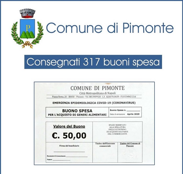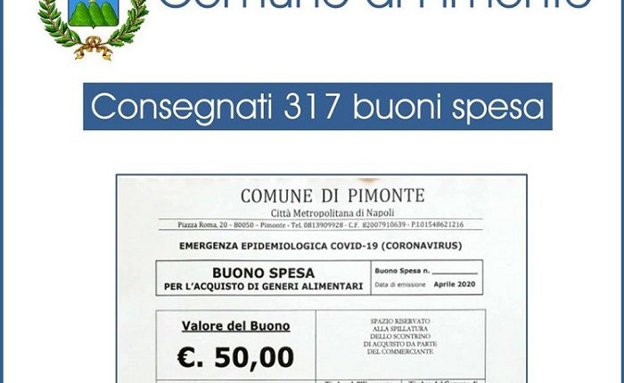 PIMONTE – Il Comune di Pimonte ha erogato 317 buoni spesa, per un valore massimo di 300 euro, alle famiglie che ne hanno fatto richiesta. Alla somma di 62mila euro, del fondo statale, si è aggiunta l’indennità di carica del sindaco, Michele Palummo. “Abbiamo messo in campo tutte le risorse di cui potevamo disporre, andando anche oltre le nostre possibilità – ha dichiarato il primo cittadino – per aiutare la comunità in un momento di estrema difficoltà in seguito all’emergenza Coronavirus.