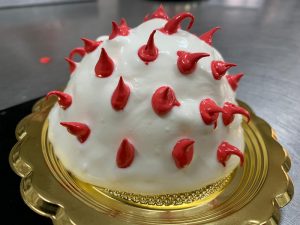 Il tutto è ricoperto da una luminosa glassa e da simpatiche sporgenze rosse in zucchero. “Il dolce – afferma Luigi Conte – nasce per sdrammatizzare questo momento che sta attanagliando l’intero globo. Noi italiani siamo creativi, innovativi e combattivi. Proprio per questo non dobbiamo farci abbattere dal virus, ma dobbiamo affrontarlo. L’idea è nata solo qualche giorno fa parlando proprio del Coronavirus con il mio caro amico Umberto Guarino.