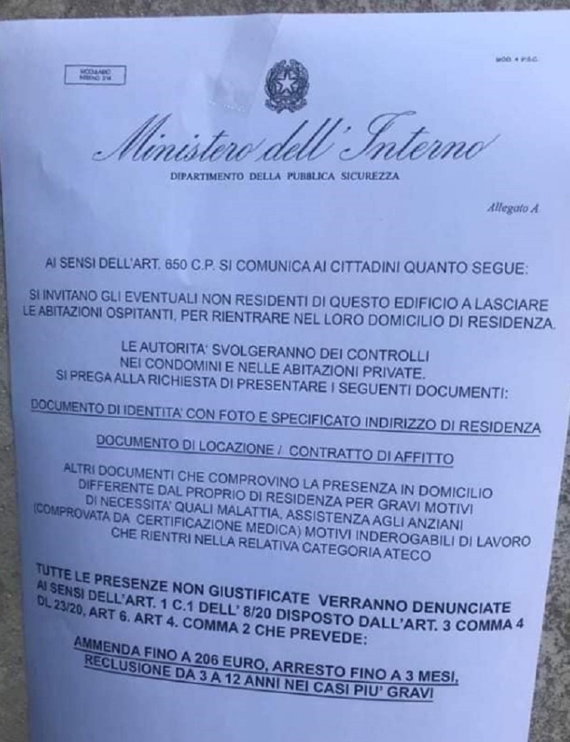 Ecco, di seguito, l’avviso alla cittadinanza: “Abbiamo appreso che in alcune città della provincia, all’interno di alcuni condomini, sono stati affissi degli avvisi recanti l’intestazione “Ministero dell’Interno – Dipartimento della Pubblica Sicurezza” con cui si preannunciano controlli nelle abitazioni.