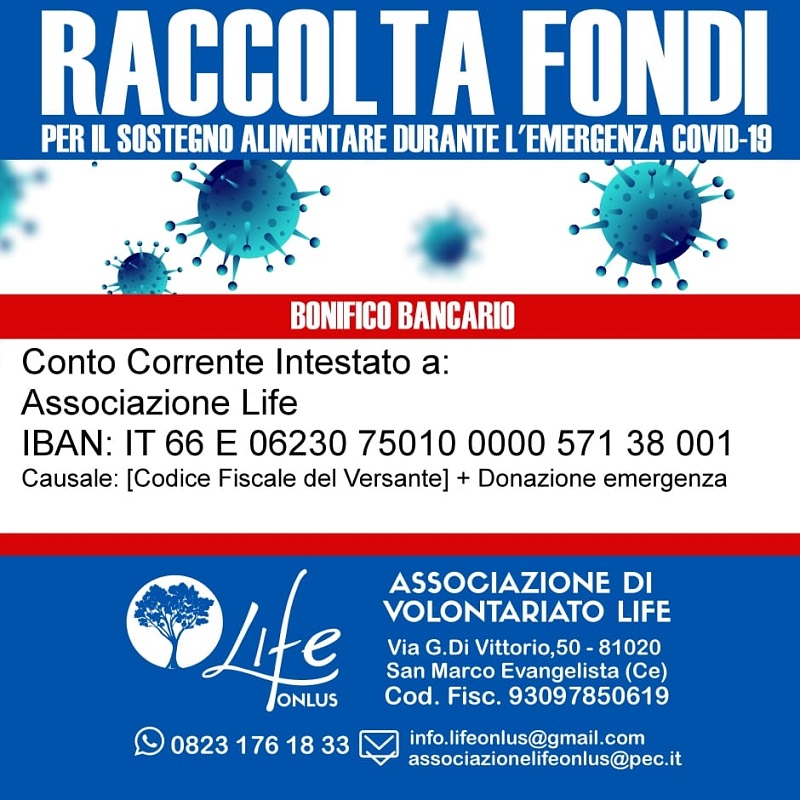 L’Associazione Life”, con sede a San Marco Evangelista in provincia di Caserta, lancia l’allarme: “Mancano dispositivi di protezione individuale per i volontari degli enti del terzo settore impegnati in prima linea per garantire i servizi”. Un appello generale di richiesta di aiuto ad aziende, enti, fondazioni, negozi, farmacie e privati per reperire dispositivi di protezione individuale (Dpi) per i 15 volontari impegnati nella distribuzione degli alimenti alle famiglie bisognose.