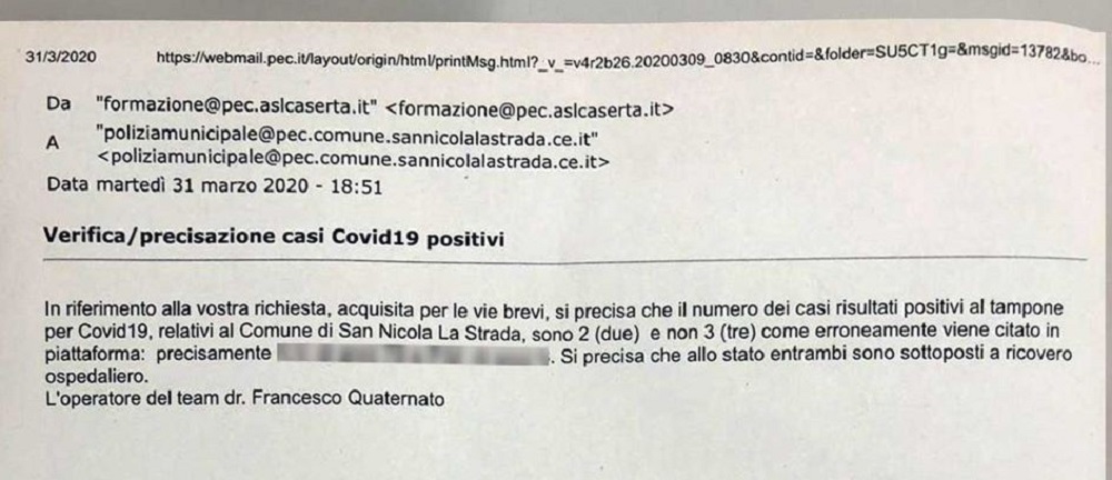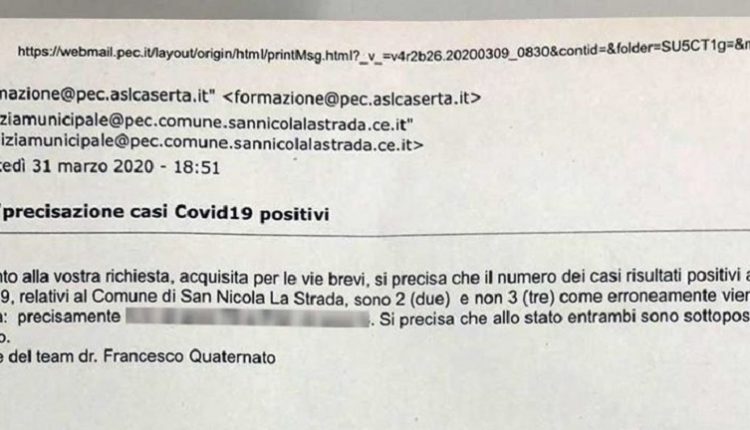 Venuto a conoscenza di quanto stava succedendo, il primo cittadino ha telefonato immediatamente ai vertici dell’ASL di Caserta che, resosi conto dell’errore, provvedeva ad inviare una PEC alla Polizia Municipale dove veniva precisato che i casi positivi sono DUE e non tre. Di seguito, pubblichiamo il post del Sindaco Marotta in merito che chiede alla cittadinanza di non farsi prendere dal “panico”: “Una precisazione innanzitutto: al momento in cui scrivo, le persone risultate positive al Covid-19 a San Nicola la Strada sono DUE.
