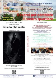 Nell’immediato partirà una mostra fotografica, dal titolo “Quello che resta” di Daria Miselli. Sarà inaugurata giorno 11 febbraio e sarà visitabile fino al 3 marzo su appuntamento.