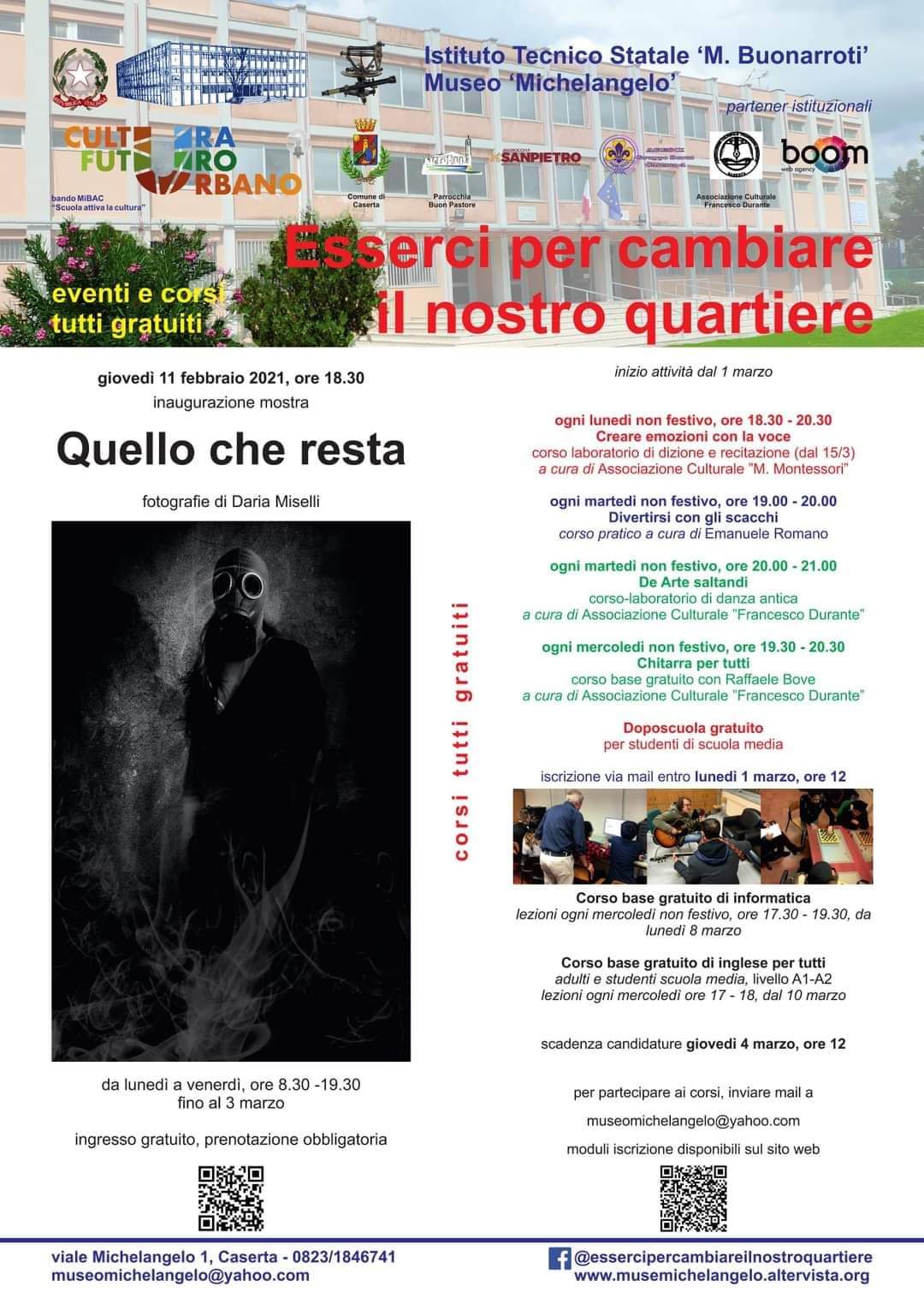 Caserta. L’istituto Buonarroti continua a crescere senza sosta e ad ampliare il suo raggio di azione, divenendo luogo di incontro, punto di riferimento, sede di tante iniziative culturali e non solo, totalmente gratuite e destinate ai cittadini tutti. La locandina riassume ciò che partirà nell’immediato. Esserci per cambiare il nostro quartiere, non è un semplice slogan ma rispecchia ciò che il Buonarroti è oggi, grazie al lavoro costante della Dirigente Vittoria De Lucia, che con la sua esperienza, insieme al personale che coordina, sta realizzando iniziative notevoli ed innovative.