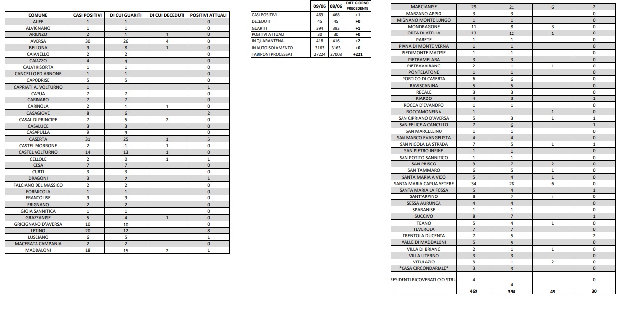 Il numero dei decessi legati al coronavirus, nel Casertano, è stabile a 45 su un totale di 469 casi di contagio. Infine le persone attualmente positive sono 30.